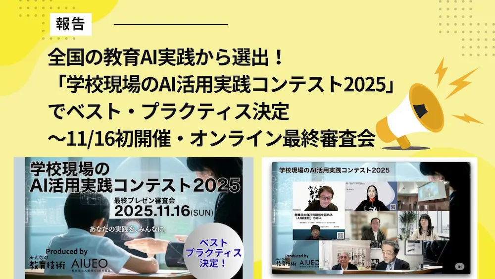 今年11月16日、教育AI活用協会と小学館「みんなの教育技術」編集部が初開催した「学校現場のAI活用実践コンテスト2025」の最終審査会がオンラインで行われました。