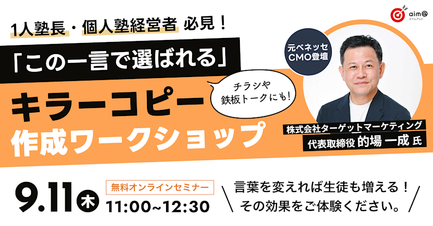 そんな学習塾経営者の多くの皆様が抱える課題に、たった一言でお客様に“選ばれる塾”になるための「キラーコピー作成術」で答えます。
