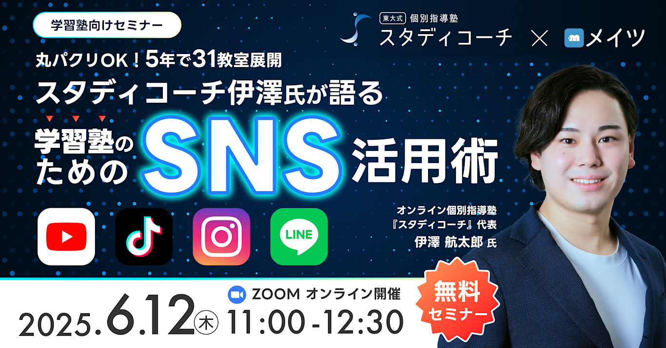 本セミナーでは、5年で31教室の展開を実現したオンライン個別指導塾『スタディコーチ』代表・伊澤航太郎氏をお招きし、学習塾がSNSを使って“戦略的に生徒を集める”ための導線設計を具体的にご紹介します。