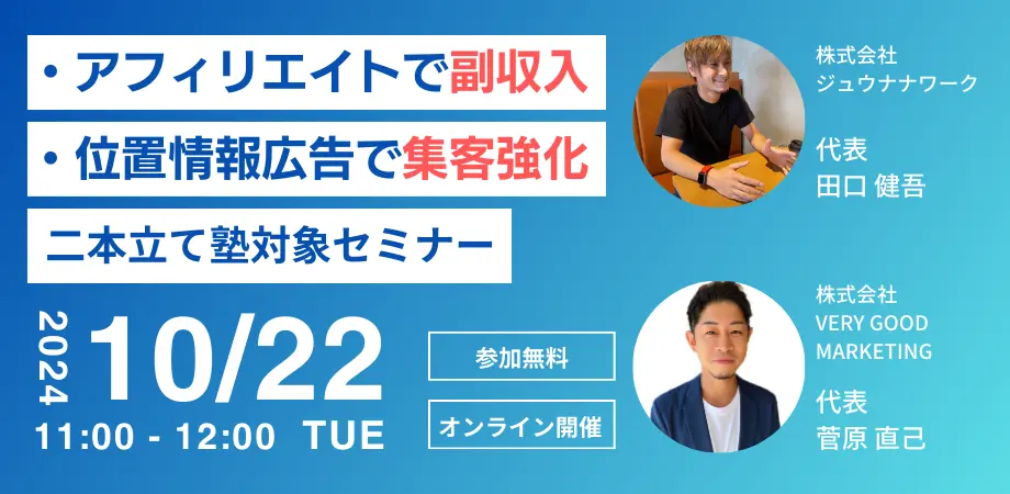 本セミナーは、塾比較サイトを活用して副収入が得られる弊社の「アフィリエイトプログラム」と、株式会社VERY GOOD MARKETING様が提供している位置情報広告広告サービス「デジポス」の仕組みをご紹介する二本立てセミナーとなります。