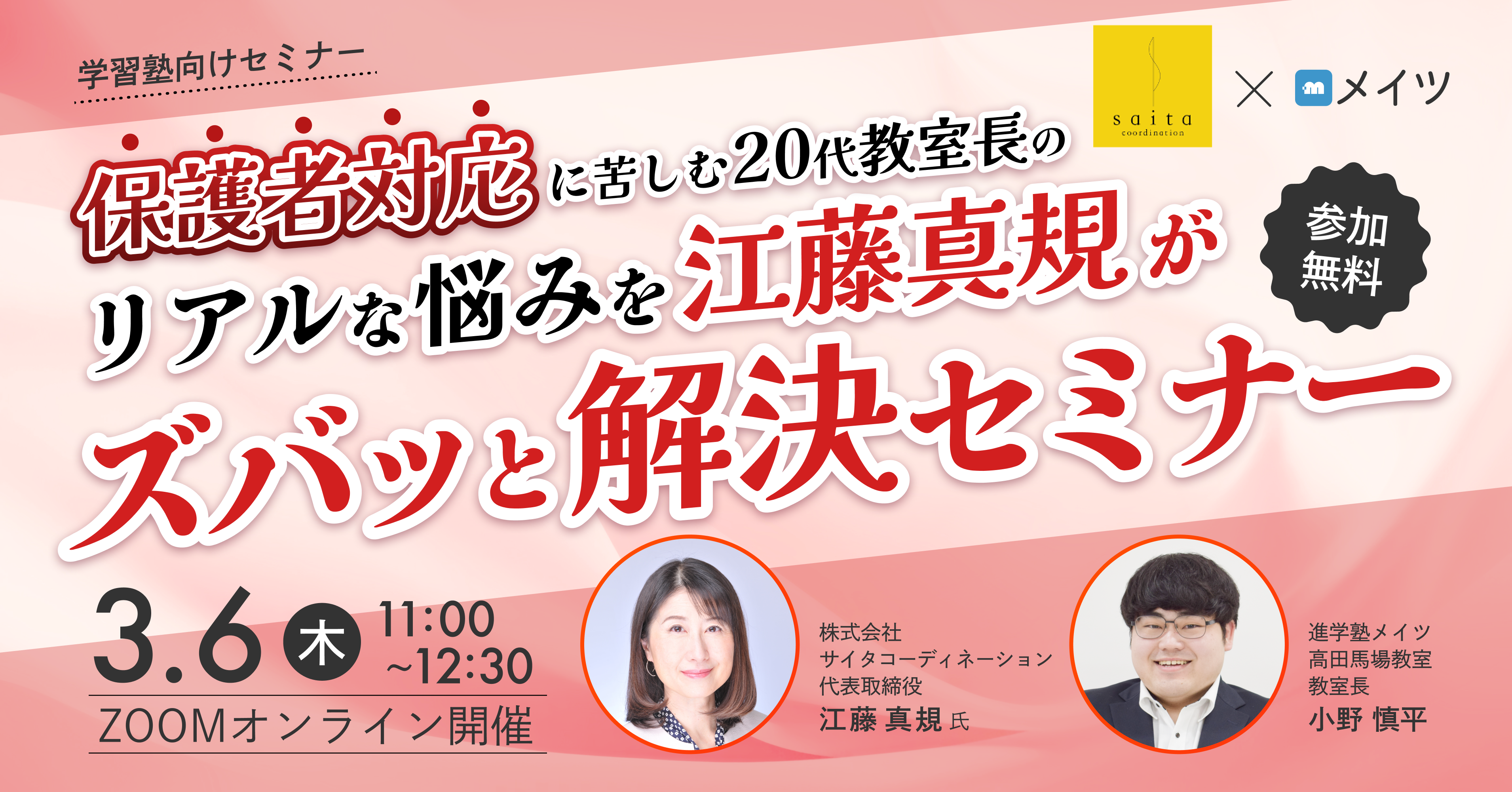 本セミナーでは、株式会社サイタコーディネーションの江藤真規氏にご登壇いただき、弊社運営塾の教室長との対談形式で、保護者対応のリアルな悩みとその対応策をより具体的にご紹介いたします。