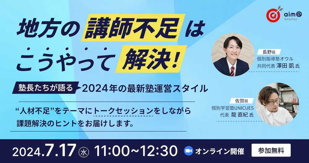 本セミナーでは、「個別指導塾オウル」(長野県)の澤田氏、「個別学習塾UNICUES」(佐賀県)の龍氏をお招きし、”人材不足”をテーマにトークセッションを行います!