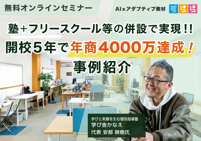そこで今回は、すららで塾開校後、「あらゆる子供がハッピーになれる」居場所づくりをコンセプトに、地域のニーズに応え、フリースクール、通信制高校も次々と開校され、塾開業5年目で年商4000万を達成された、長野県川中島にある「学び舎かなえ」代表の安部先生をお招きしてセミナーを開催いたします!多角化運営のきっかけや、実際の生徒さんの対応についてお話しいただきます!