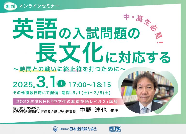 今回開催するセミナー『英語の入試問題の長文化に対応する ~時間との戦いに終止符を打つために~』では、NPO英語運用能力評価協会(ELPA)協力のもと、同協会理事長でもある、駒沢女子大学の中野達也先生より、近年の英語の入試問題に対応していくためにどのような勉強をしていけばよいのか、中学生・高校生が心がけておきたい勉強のコツやアドバイスなどをご講演いただきます。