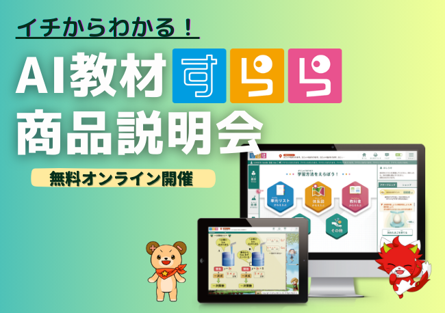 AI教材「すらら」の生徒画面、先生用の管理画面をお見せし、「すらら」を活用してできることなどをお伝えいたします。