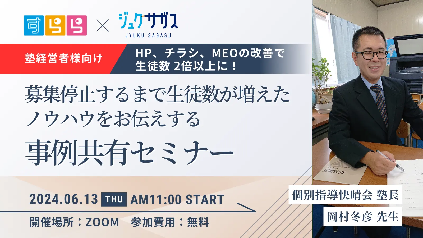 講師に、個別指導快晴会塾長の岡村冬彦先生をお招きし、実際に経営危機から脱却したマーケティング戦略を細かくご紹介いただきます。机上の空論ではないリアルな塾経営のお話を伺える貴重な機会です。ぜひご参加ください!