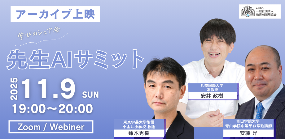 2025年8月22日に衆議院第一議員会館で開催された「教育AIサミット2025」内の人気セッション『先生AIサミット』のアーカイブ映像をオンラインで特別上映します。